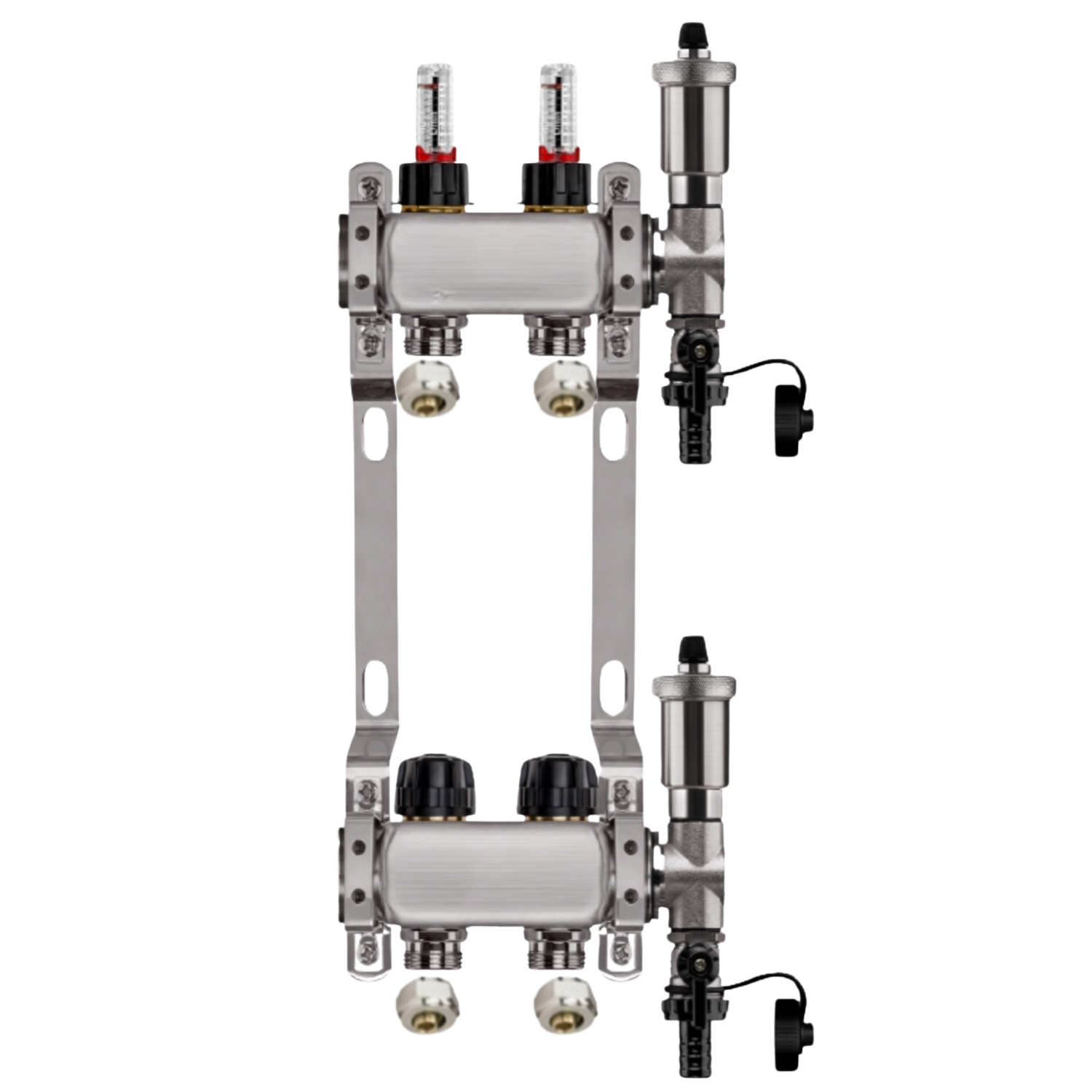 Zestaw wyposażony jest w przepływomierze (rotametry) z zaworami regulacyjnymi, które umożliwiają precyzyjną i szybką regulację przepływu dzięki skali umieszczonej na zaworze (do 5 l/min). Dodatkowo, w skład zestawu wchodzi zespół odpowietrzająco-spustowy z automatycznym odpowietrznikiem i systemem Aquastop, chroniący przed zalaniem. Zawór stopowy pozwala na łatwą wymianę i konserwację odpowietrznika bez konieczności opróżniania instalacji. Zawory termostatyczne z pokrętłami umożliwiają wyrównanie przepływu w pętlach o różnej długości oraz zrównoważenie instalacji pod względem oporów hydraulicznych. Wkładki termostatyczne są przystosowane do montażu siłowników elektrycznych M30x1,5, co pozwala na ręczną regulację przepływu lub całkowite zamknięcie wybranej pętli.