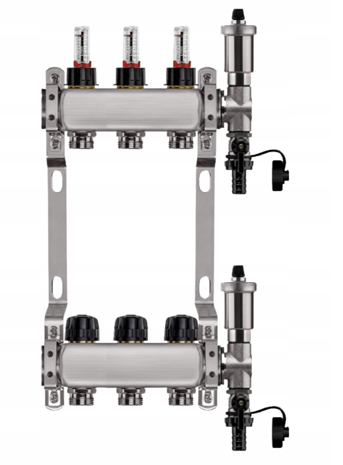 Zestaw wyposażony jest w przepływomierze (rotametry) z zaworami regulacyjnymi, które umożliwiają precyzyjną i szybką regulację przepływu dzięki skali umieszczonej na zaworze (do 5 l/min). Dodatkowo, w skład zestawu wchodzi zespół odpowietrzająco-spustowy z automatycznym odpowietrznikiem i systemem Aquastop, chroniący przed zalaniem. Zawór stopowy pozwala na łatwą wymianę i konserwację odpowietrznika bez konieczności opróżniania instalacji. Zawory termostatyczne z pokrętłami umożliwiają wyrównanie przepływu w pętlach o różnej długości oraz zrównoważenie instalacji pod względem oporów hydraulicznych. Wkładki termostatyczne są przystosowane do montażu siłowników elektrycznych M30x1,5, co pozwala na ręczną regulację przepływu lub całkowite zamknięcie wybranej pętli.