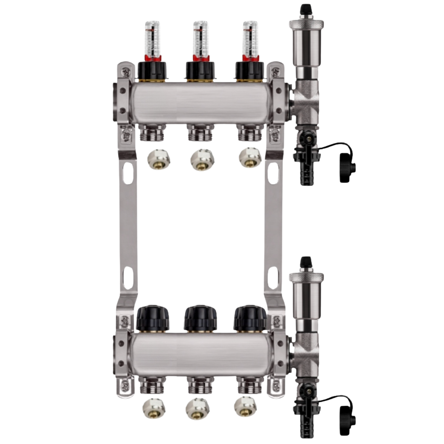 Zestaw wyposażony jest w przepływomierze (rotametry) z zaworami regulacyjnymi, które umożliwiają precyzyjną i szybką regulację przepływu dzięki skali umieszczonej na zaworze (do 5 l/min). Dodatkowo, w skład zestawu wchodzi zespół odpowietrzająco-spustowy z automatycznym odpowietrznikiem i systemem Aquastop, chroniący przed zalaniem. Zawór stopowy pozwala na łatwą wymianę i konserwację odpowietrznika bez konieczności opróżniania instalacji. Zawory termostatyczne z pokrętłami umożliwiają wyrównanie przepływu w pętlach o różnej długości oraz zrównoważenie instalacji pod względem oporów hydraulicznych. Wkładki termostatyczne są przystosowane do montażu siłowników elektrycznych M30x1,5, co pozwala na ręczną regulację przepływu lub całkowite zamknięcie wybranej pętli.