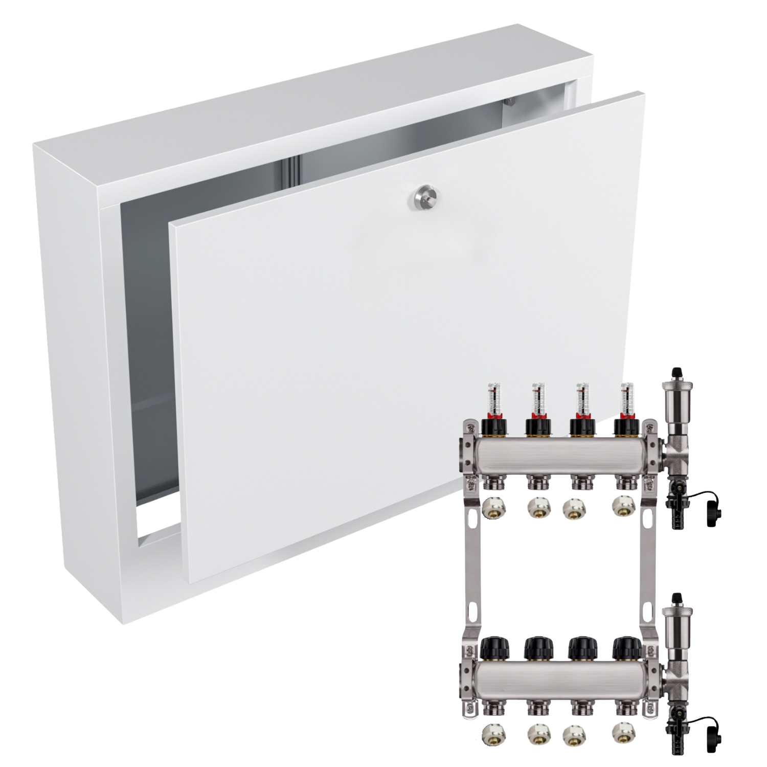 - Kompaktowe wymiary – rozdzielacz i szafka mają praktyczne wymiary, co ułatwia dopasowanie ich do różnych przestrzeni i instalacji.