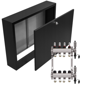 - Kompaktowe wymiary – rozdzielacz i szafka mają praktyczne wymiary, co ułatwia dopasowanie ich do różnych przestrzeni i instalacji.