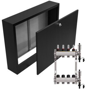 - Kompaktowe wymiary – rozdzielacz i szafka mają praktyczne wymiary, co ułatwia dopasowanie ich do różnych przestrzeni i instalacji.