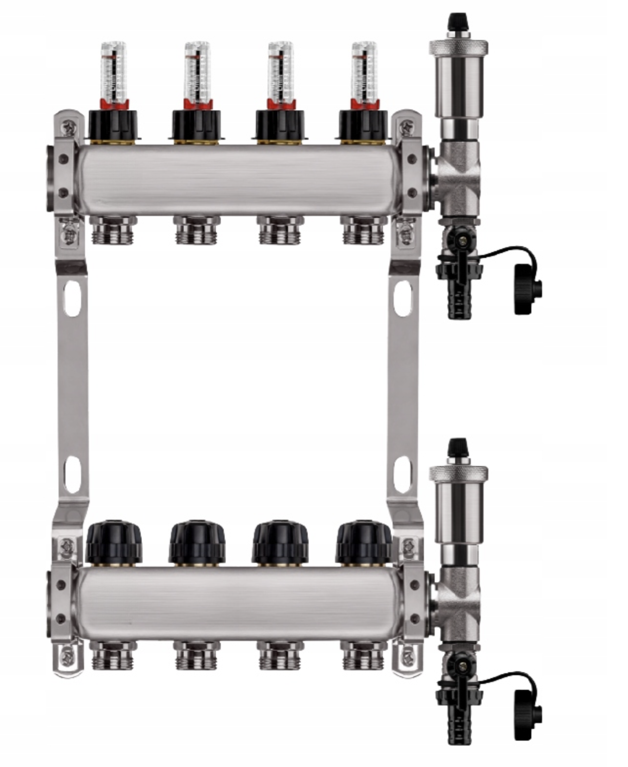Zestaw wyposażony jest w przepływomierze (rotametry) z zaworami regulacyjnymi, które umożliwiają precyzyjną i szybką regulację przepływu dzięki skali umieszczonej na zaworze (do 5 l/min). Dodatkowo, w skład zestawu wchodzi zespół odpowietrzająco-spustowy z automatycznym odpowietrznikiem i systemem Aquastop, chroniący przed zalaniem. Zawór stopowy pozwala na łatwą wymianę i konserwację odpowietrznika bez konieczności opróżniania instalacji. Zawory termostatyczne z pokrętłami umożliwiają wyrównanie przepływu w pętlach o różnej długości oraz zrównoważenie instalacji pod względem oporów hydraulicznych. Wkładki termostatyczne są przystosowane do montażu siłowników elektrycznych M30x1,5, co pozwala na ręczną regulację przepływu lub całkowite zamknięcie wybranej pętli.