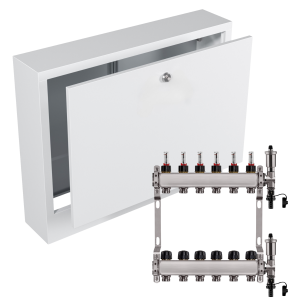 - Kompaktowe wymiary – rozdzielacz i szafka mają praktyczne wymiary, co ułatwia dopasowanie ich do różnych przestrzeni i instalacji.