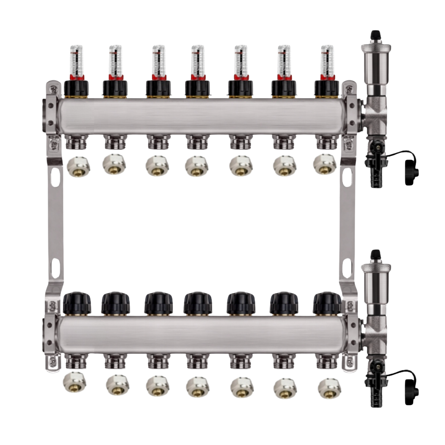 Zestaw wyposażony jest w przepływomierze (rotametry) z zaworami regulacyjnymi, które umożliwiają precyzyjną i szybką regulację przepływu dzięki skali umieszczonej na zaworze (do 5 l/min). Dodatkowo, w skład zestawu wchodzi zespół odpowietrzająco-spustowy z automatycznym odpowietrznikiem i systemem Aquastop, chroniący przed zalaniem. Zawór stopowy pozwala na łatwą wymianę i konserwację odpowietrznika bez konieczności opróżniania instalacji. Zawory termostatyczne z pokrętłami umożliwiają wyrównanie przepływu w pętlach o różnej długości oraz zrównoważenie instalacji pod względem oporów hydraulicznych. Wkładki termostatyczne są przystosowane do montażu siłowników elektrycznych M30x1,5, co pozwala na ręczną regulację przepływu lub całkowite zamknięcie wybranej pętli.