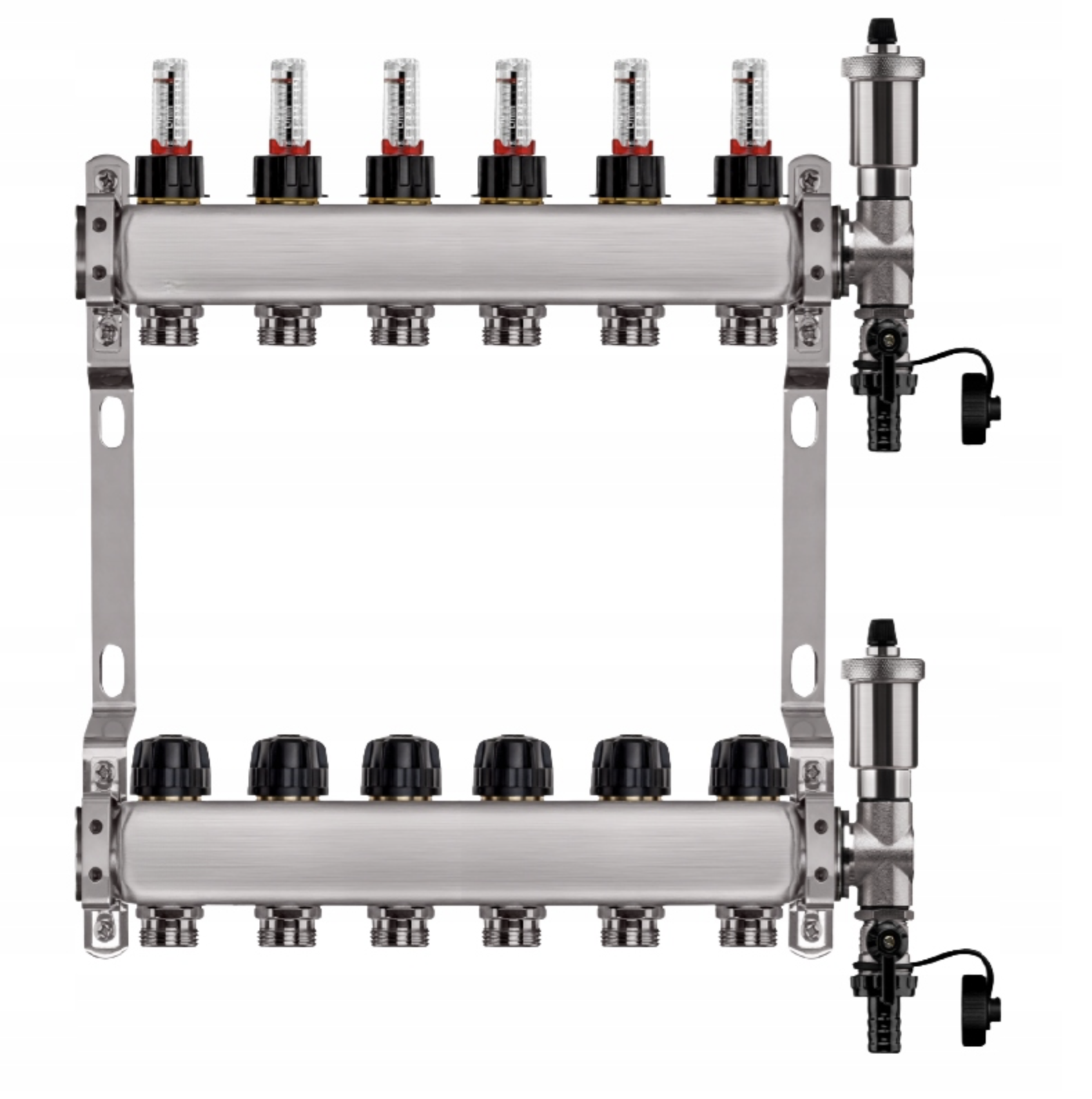 Zestaw wyposażony jest w przepływomierze (rotametry) z zaworami regulacyjnymi, które umożliwiają precyzyjną i szybką regulację przepływu dzięki skali umieszczonej na zaworze (do 5 l/min). Dodatkowo, w skład zestawu wchodzi zespół odpowietrzająco-spustowy z automatycznym odpowietrznikiem i systemem Aquastop, chroniący przed zalaniem. Zawór stopowy pozwala na łatwą wymianę i konserwację odpowietrznika bez konieczności opróżniania instalacji. Zawory termostatyczne z pokrętłami umożliwiają wyrównanie przepływu w pętlach o różnej długości oraz zrównoważenie instalacji pod względem oporów hydraulicznych. Wkładki termostatyczne są przystosowane do montażu siłowników elektrycznych M30x1,5, co pozwala na ręczną regulację przepływu lub całkowite zamknięcie wybranej pętli.
