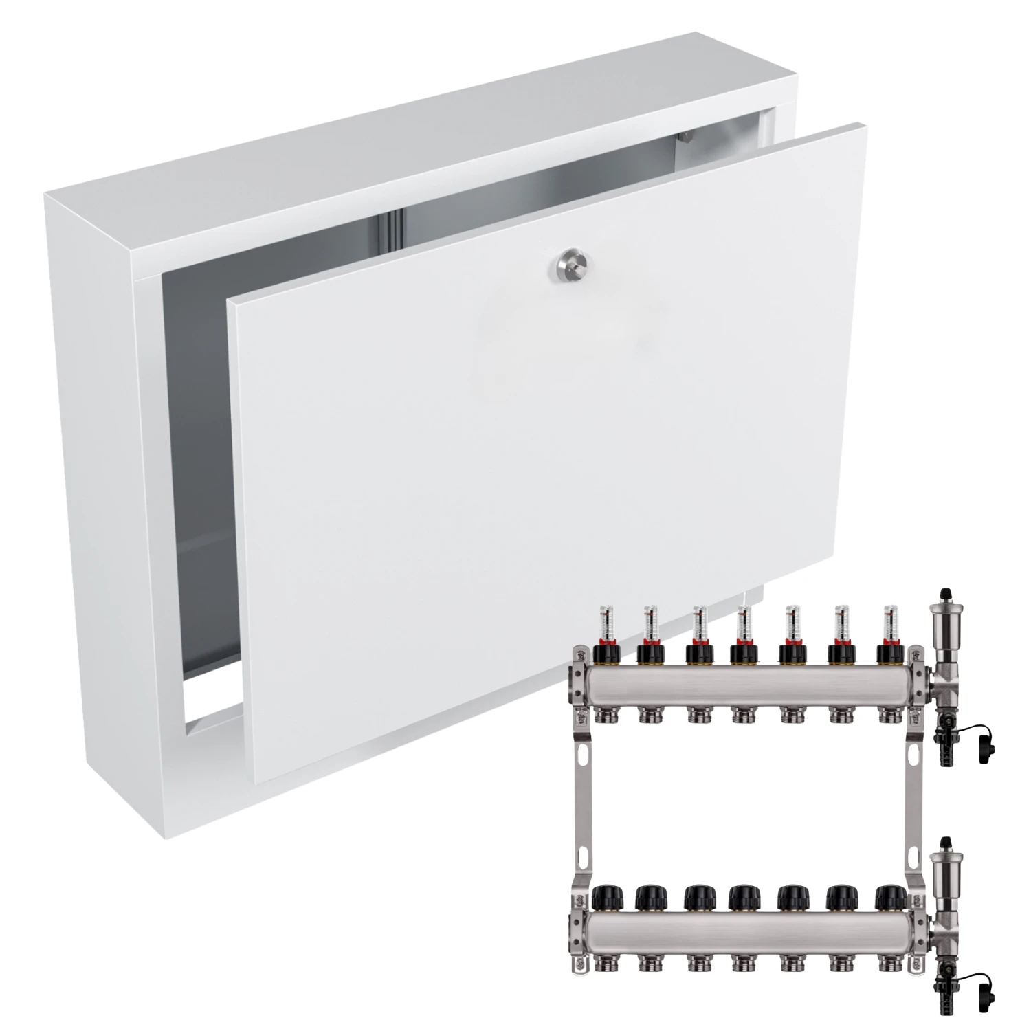 - Kompaktowe wymiary – rozdzielacz i szafka mają praktyczne wymiary, co ułatwia dopasowanie ich do różnych przestrzeni i instalacji.