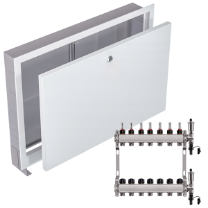 - Kompaktowe wymiary – rozdzielacz i szafka mają praktyczne wymiary, co ułatwia dopasowanie ich do różnych przestrzeni i instalacji.