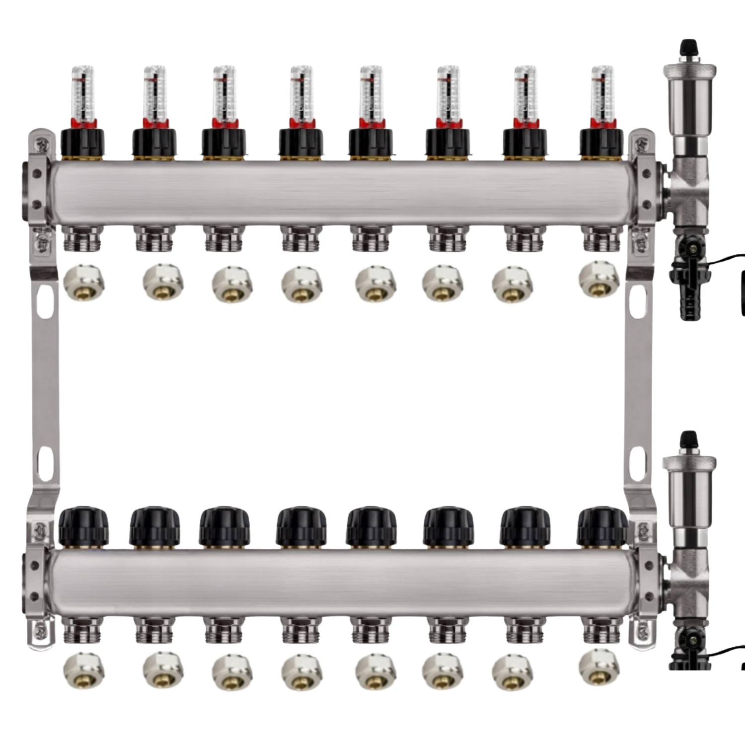 Zestaw wyposażony jest w przepływomierze (rotametry) z zaworami regulacyjnymi, które umożliwiają precyzyjną i szybką regulację przepływu dzięki skali umieszczonej na zaworze (do 5 l/min). Dodatkowo, w skład zestawu wchodzi zespół odpowietrzająco-spustowy z automatycznym odpowietrznikiem i systemem Aquastop, chroniący przed zalaniem. Zawór stopowy pozwala na łatwą wymianę i konserwację odpowietrznika bez konieczności opróżniania instalacji. Zawory termostatyczne z pokrętłami umożliwiają wyrównanie przepływu w pętlach o różnej długości oraz zrównoważenie instalacji pod względem oporów hydraulicznych. Wkładki termostatyczne są przystosowane do montażu siłowników elektrycznych M30x1,5, co pozwala na ręczną regulację przepływu lub całkowite zamknięcie wybranej pętli.