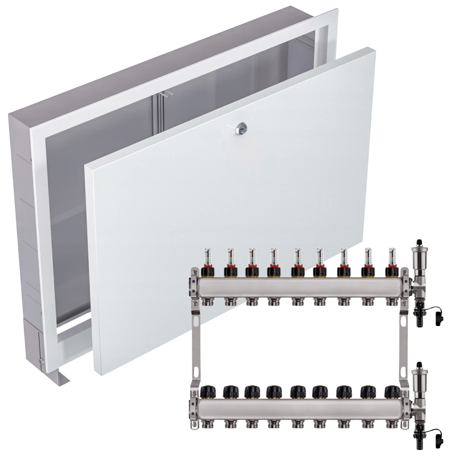 - Kompaktowe wymiary – rozdzielacz i szafka mają praktyczne wymiary, co ułatwia dopasowanie ich do różnych przestrzeni i instalacji.