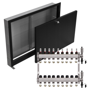 - Kompaktowe wymiary – rozdzielacz i szafka mają praktyczne wymiary, co ułatwia dopasowanie ich do różnych przestrzeni i instalacji.