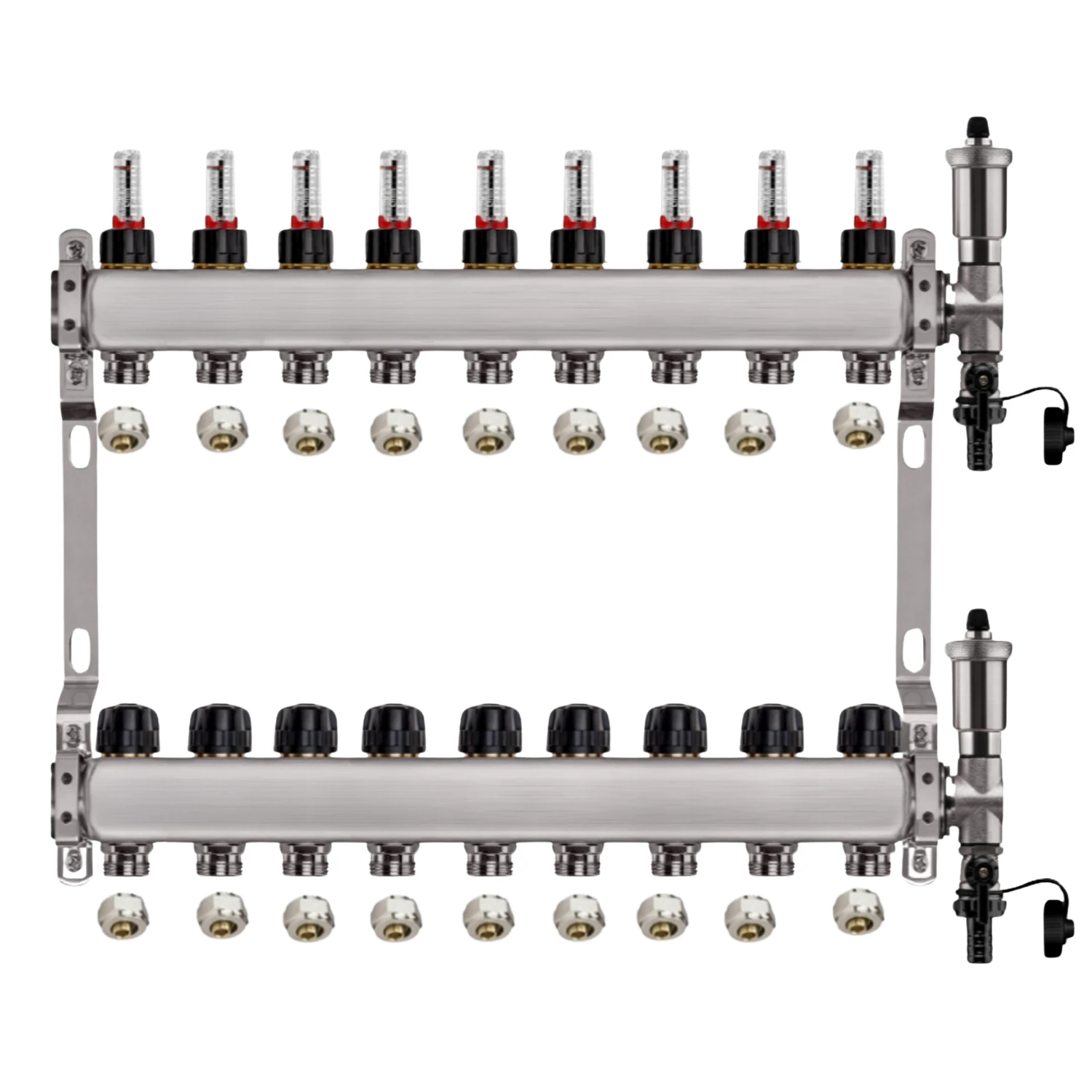 Zestaw wyposażony jest w przepływomierze (rotametry) z zaworami regulacyjnymi, które umożliwiają precyzyjną i szybką regulację przepływu dzięki skali umieszczonej na zaworze (do 5 l/min). Dodatkowo, w skład zestawu wchodzi zespół odpowietrzająco-spustowy z automatycznym odpowietrznikiem i systemem Aquastop, chroniący przed zalaniem. Zawór stopowy pozwala na łatwą wymianę i konserwację odpowietrznika bez konieczności opróżniania instalacji. Zawory termostatyczne z pokrętłami umożliwiają wyrównanie przepływu w pętlach o różnej długości oraz zrównoważenie instalacji pod względem oporów hydraulicznych. Wkładki termostatyczne są przystosowane do montażu siłowników elektrycznych M30x1,5, co pozwala na ręczną regulację przepływu lub całkowite zamknięcie wybranej pętli.