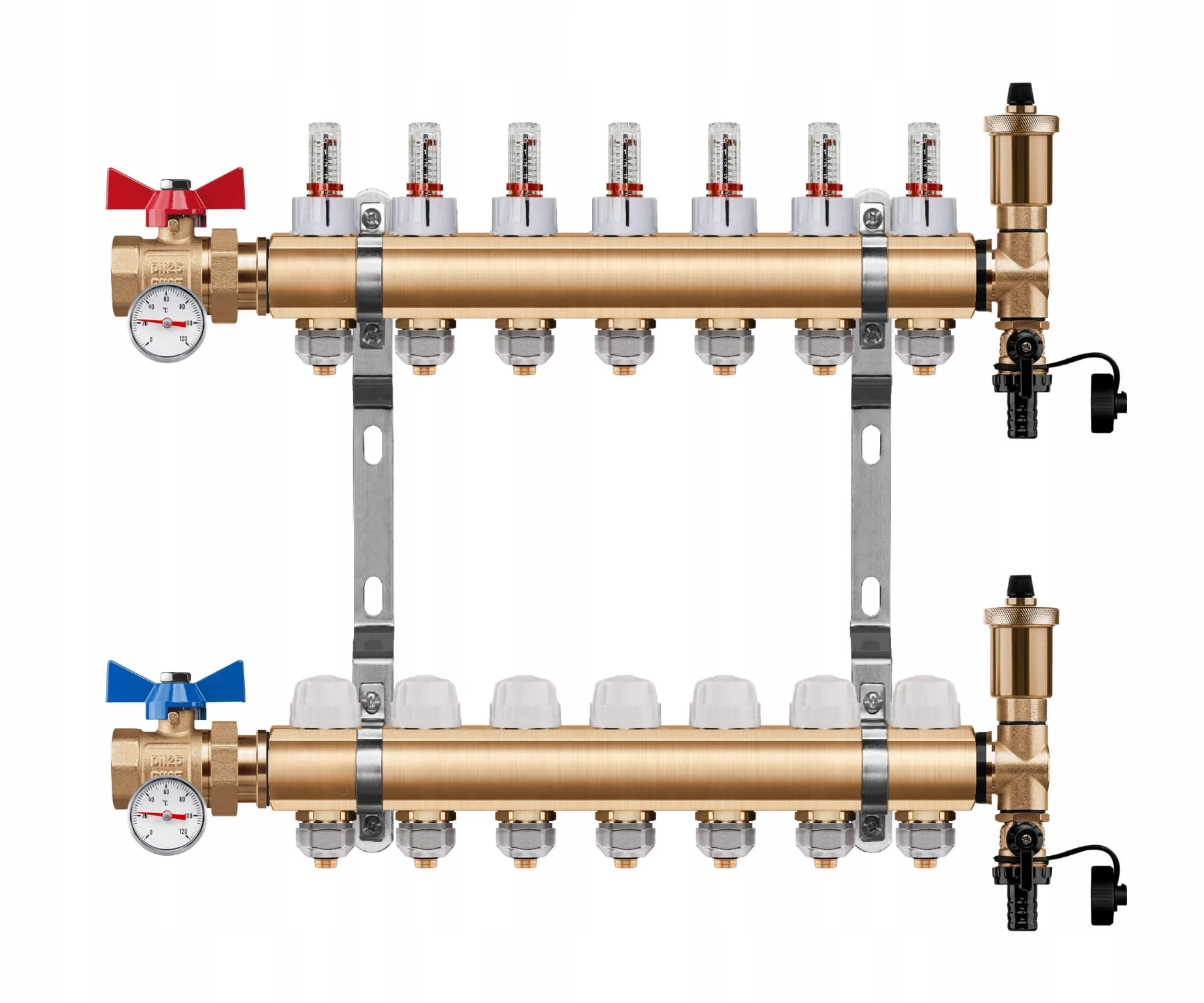 ROZDZIELACZ PODŁOGÓWKI 7 OBWODY + ZAWOR KULOWY PROSTY + TERMOMETR + PEX